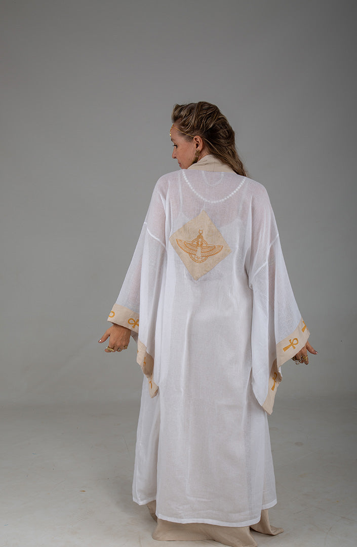 Long Kimono made of white turkish cotton, with sand linen ankh trims. Divinity expressed. Wrapped in regal robes.
